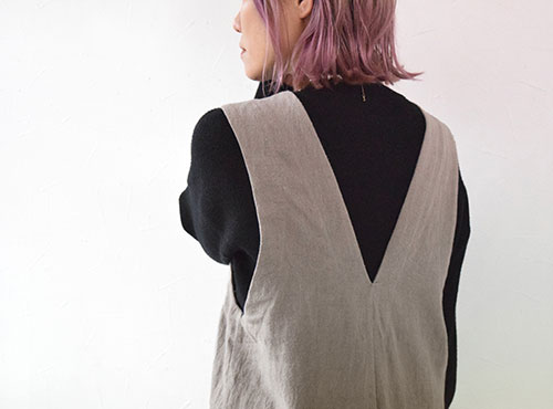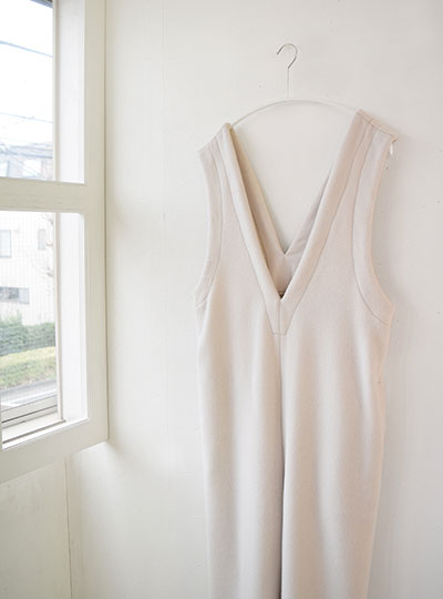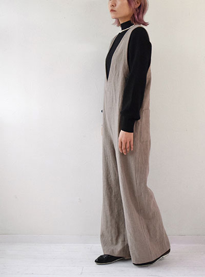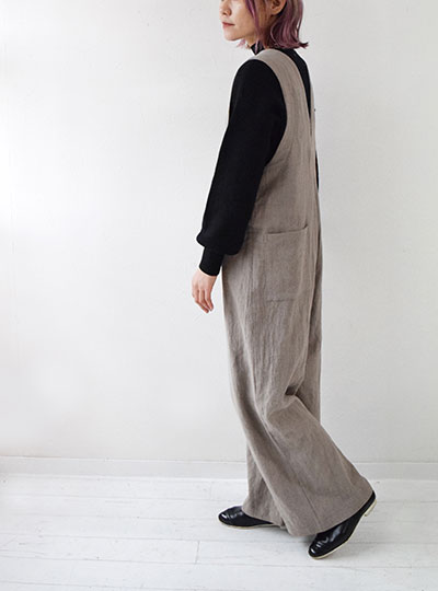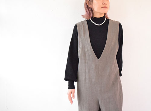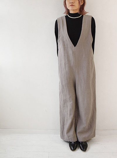 | 前後が深めのVになっている『サロペット【4】』 この深めのVネックが大人っぽく、 前から見ても後ろから見ても素敵 縦長シルエットなので、着やせ効果も抜群です。 |
