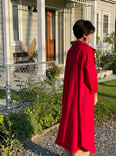 | こんにちは、スタッフ マーガレットです。 チャレンジパターンの「ショールガウン」を 「トリプルウォッシュリネン」で作ってみました。 |