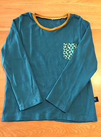 | 衿元をミルク色のスパンで切り替えて、 これはこれで可愛いのですが 生地の柔らかさもあってか若干パジャマ感があって… 何とかしようと思い 胸元にワッペンと裾に飾りポケットを付けて パジャマ感から脱出しました。(のつもり) 次は『スムース生地』ターコイズ |