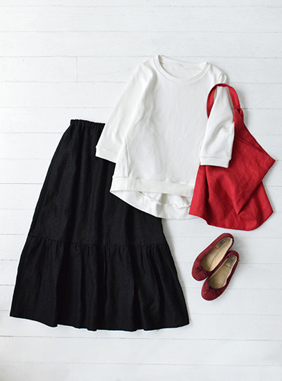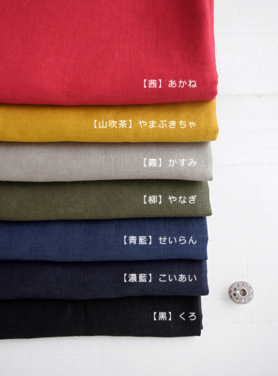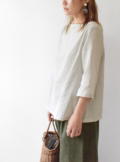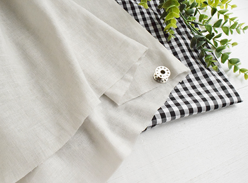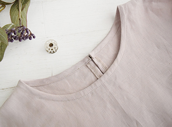 | 衿元、袖ぐりのバイアステープには 『ヨーロッパリネン-和‐【茜】』を使い、 少しだけ見えるようにしました。 |