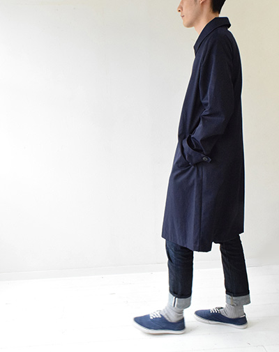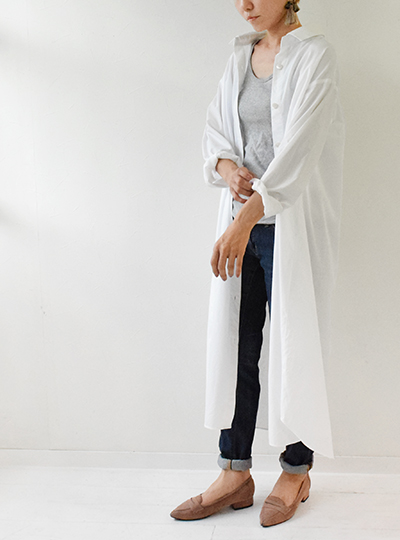 | 抜き衿シャツをアレンジ(着丈50cmほど長く)されたそうです。 実はこの抜き衿シャツのコートアレンジは 社内でもじわじわ人気上昇中! |