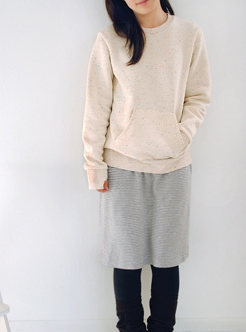 | 「【ライトグレー】ダブルガーゼ」で作ったサンプルは ふんわり感が増しています。 着心地は変わりなく、 ふわっとした印象も変わりありません。 少しだけ、切り替え位置が下に下がり 36サイズよりは落ち着いた印象になりました。 |