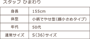 | ■スタッフ ひまわり こんにちは。 スタッフ ひまわりです。 今回は新商品『No.143 ターンアップパンツ』をはいてみました。 身長155cm、腰回りはあまり大きくありませんが、 下腹部が気になってついつい隠しがちです。 普段はSサイズ、36サイズを選ぶことが多いのですが たまにワンサイズ大きめを選ぶことがあります。 今回試着した『No.143 ターンアップパンツ』は 全体的なラインがゆったりめです。 まず、いつもの36サイズ |