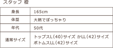 | ■スタッフ 橙 身長165cm、 体の幅、厚みともにしっかりとしているスタッフ 橙です。 普段、トップスはLかLLサイズを着ています。 ボトムスはLLサイズです。 ゆったりストンとした、体のラインの出ないものが好みです。 まず自分的に安心な42サイズ お、すっとはける! 腰回り、太もも回りともにゆとりがあり、 はいていて楽ちんです。 しゃがんだり、ひざを曲げる動作をしてみても きつかったりすることはありません。 裾に向かってすこし細くなっているので すっきりしてスタイルがよく見える感じがします。 そして折り返された裾がかっこいい印象です。 |