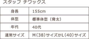 | ■スタッフ チワックス 狛江店スタッフのチワックスです。 身長155cm弱。身長は低めですが 普段のボトムスは、 丈に合わせると38サイズ、 もしくは36サイズでもちょうどいいくらいですが ウエスト、ヒップに合わせると、 40サイズ相当な体型です。 『No.145 ニットフレアスカート』を着てみました。 |