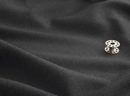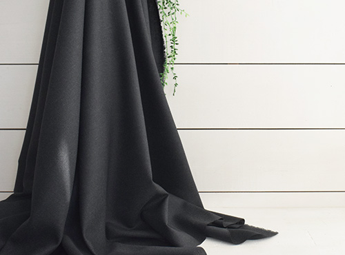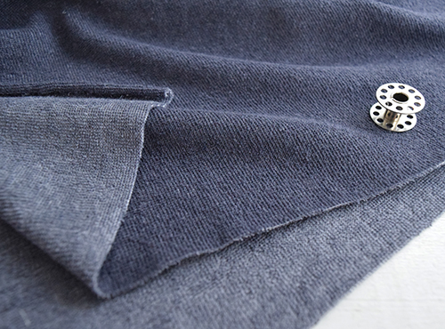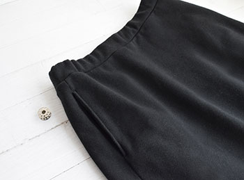 | この生地のしっとりした布帛のような風合いが このパターンに◎ テンション(生地の伸縮性)が低めですが、 縦方向にはよく伸びます。 この『ニットフレアスカート』をつくるなら、 地の目を横にして、 差し込みで裁断してくださいね。 |