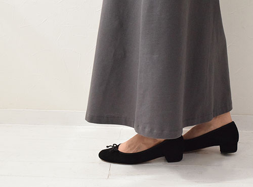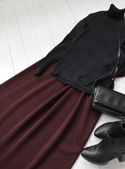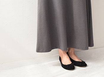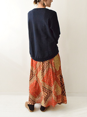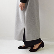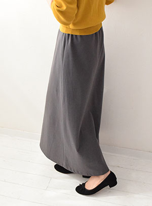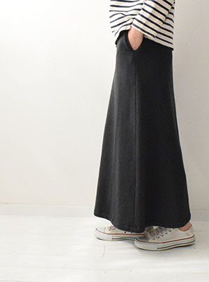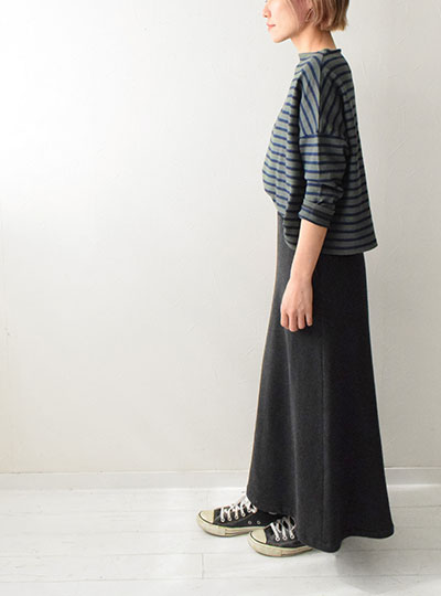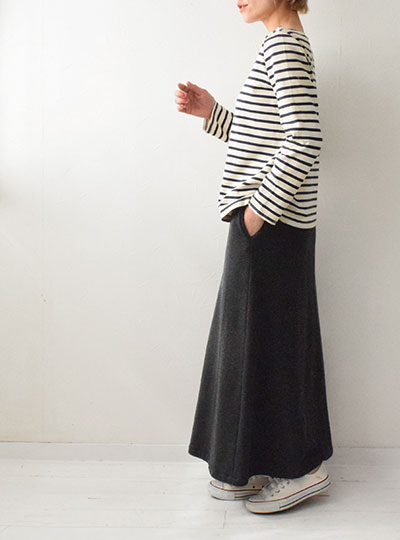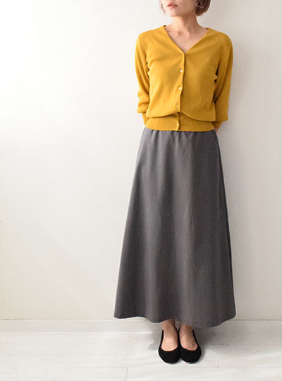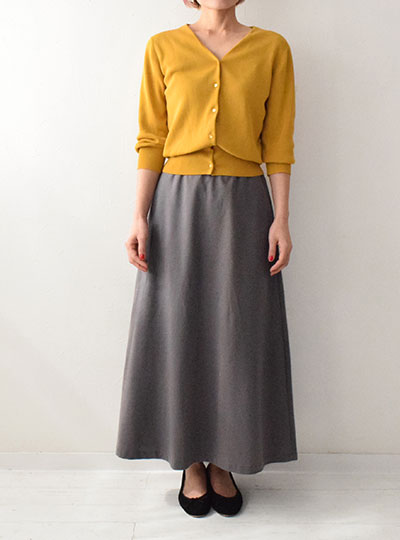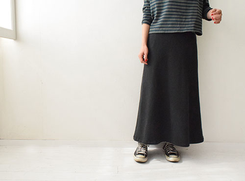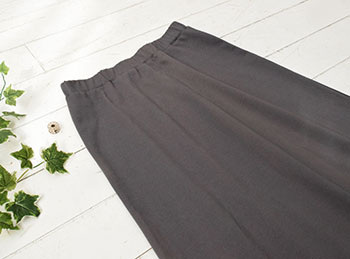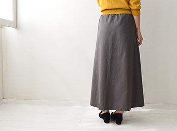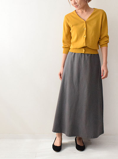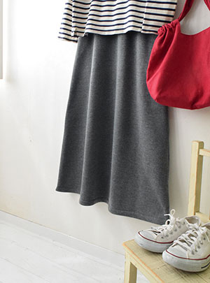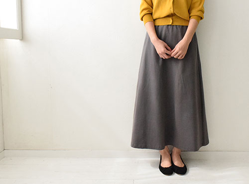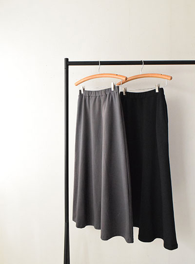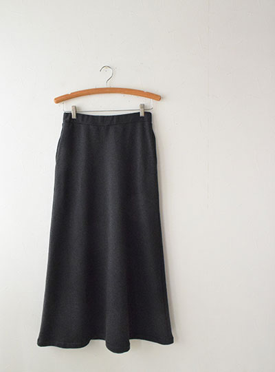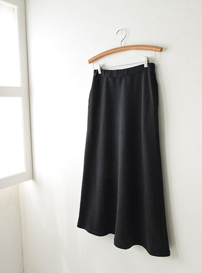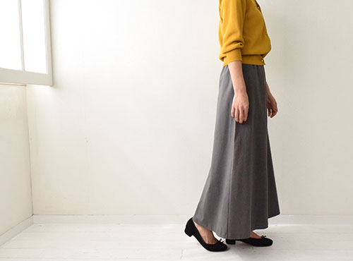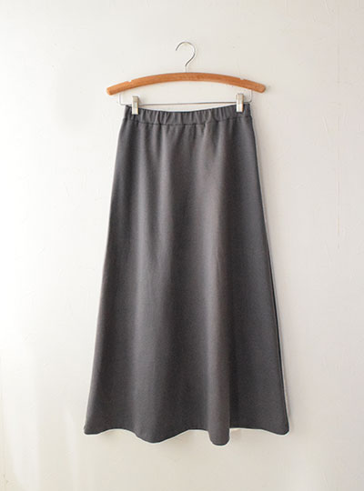 | 落ち着いたAラインのシルエットは 広がりすぎないのですっきりとした印象。 ニット生地でつくるので、 落ち感がきれいで、抜群の穿き心地! ウエストはゴム仕様で楽ちんなのに 腰やヒップまわりはすっきり。 着痩せ効果も抜群です(*^^)v |