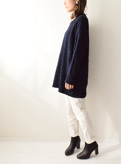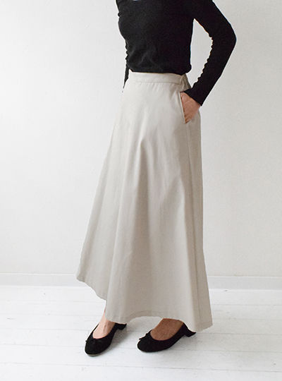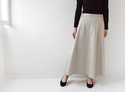 | ギャザーもタックもないシンプルなデザインですが 穿いてみたら、 太ももあたりから裾まで ドレープがとてもきれいで、 女性らしい素敵なシルエットでした。 あれ? このコメント、どっかで見覚えが… きれいめアイテムの 布帛で作る『No.125 シンプルフレアスカート』を着た時の感想でした。 |