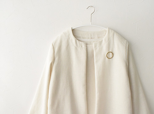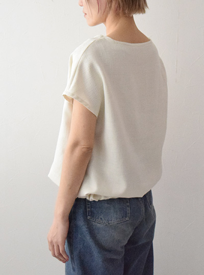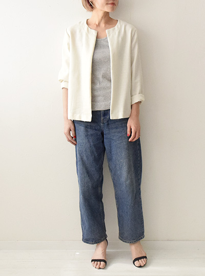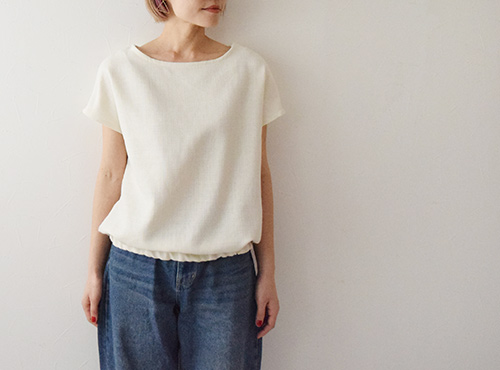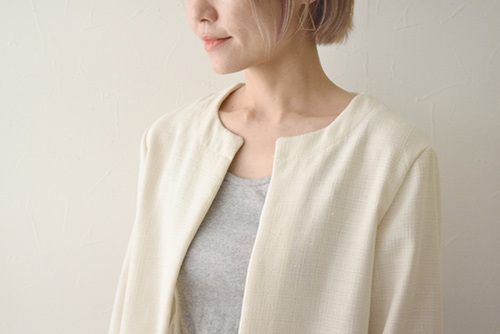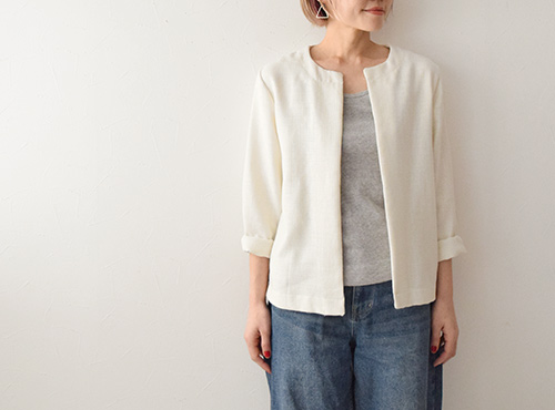 | さっそく『ボートネックブラウス【2】』を作りました。 毎年春先に着るわたしの定番です! そして、【ホワイト】は、『フレンチブラウス』と 『ノーカラージャケット』をセットアップで作りました。 |