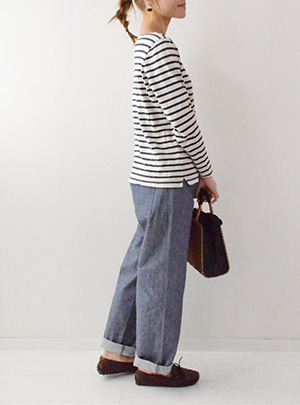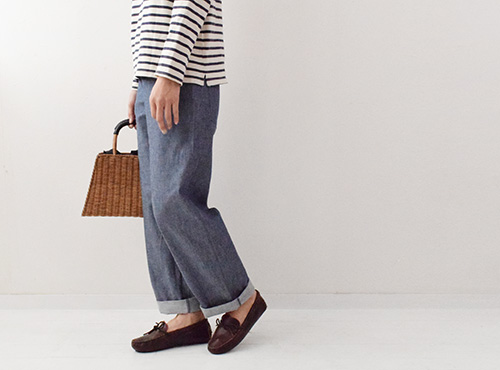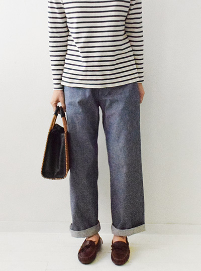 | さっそくサンプルを試着してみることに。 太すぎず、細すぎず、 リラックス感のあるほどよい太さです。 少しテーパードになっていてすっきりとしたシルエット。 そして折り返したダブルの裾がこなれ感を演出してくれて◎ う〜んすべてがわたし好み(∩´∀`)∩ 「ターンアップパンツ」に即決です! |