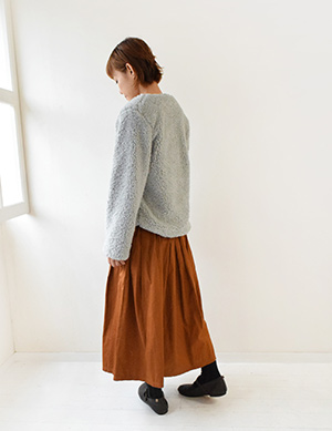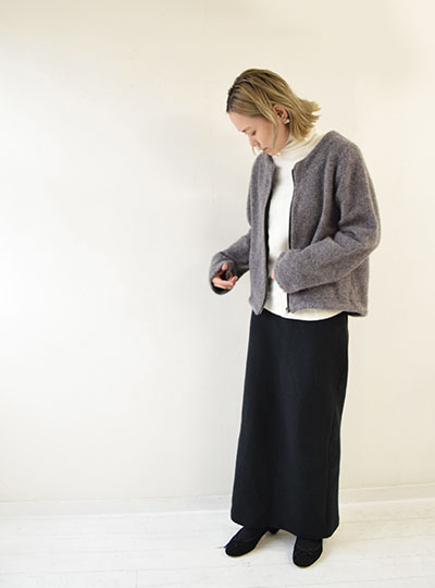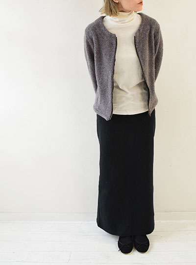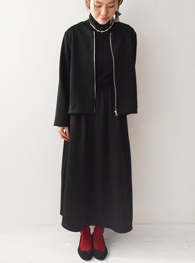 | 42サイズ 生地:中程度の厚みのニット オープンファスナー【ブラック/シルバー】 ボトムスパターン:シンプルギャザースカート/ ギャザー少なめ(丈を15cm長くアレンジ) モデル身長:163cm (通常トップス38サイズ、ボトムス36サイズのモデルが着用) |