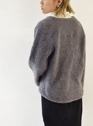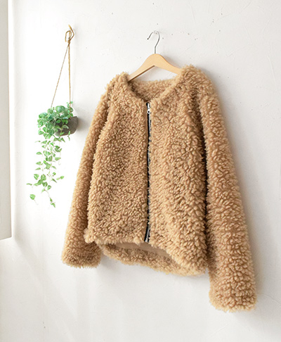 もこもこふわふわ ショート丈ファーブルゾン ふんわりとあたたかなファーで仕立てたジップブルゾン。 Vネックが上品な印象で 大人が着ても甘くなりすぎないデザインになっています。 太めのお袖と短い着丈で少しだけリラックスしたシルエットは 衿を抜くような感じにルーズな雰囲気で着こなすのがおすすめです。 実際に着てみたら軽くて暖かい、そしておしゃれに見える! 裏地はついていないものの、秋~冬のはじめにも着られるぬくぬく加減。 うしろは裾が長くなっていてラウンドしているので、 ファスナーを閉めても開けてもスタイルがよく見えます。 |